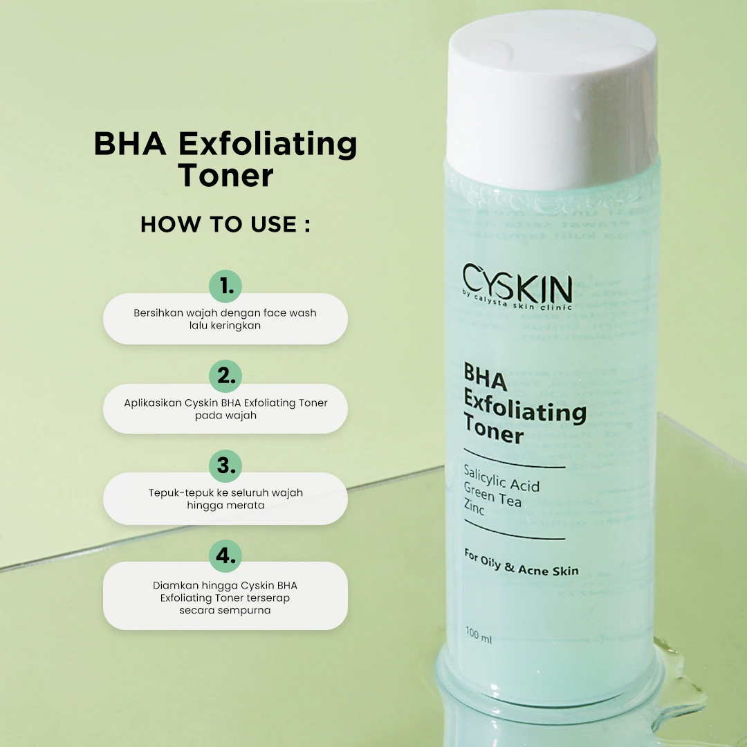 BHA Exfoliating Toner adalah exfoliating toner yang diformulasikan dengan kombinasi zat aktif Salicylic Acid, Green Tea dan Zinc Sulfate. BHA Exfoliating Toner berfungsi untuk menyegarkan, membantu mengatasi jerawat serta mengangkat sel-sel kulit mati sehingga kulit tampak cerah dan halus.